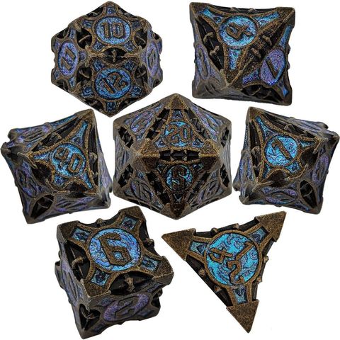 Oyunlarda gelişmiş görünürlük için yedi çokyüzlü ejderha şeklinde Metal D & D zar oyulmuştur